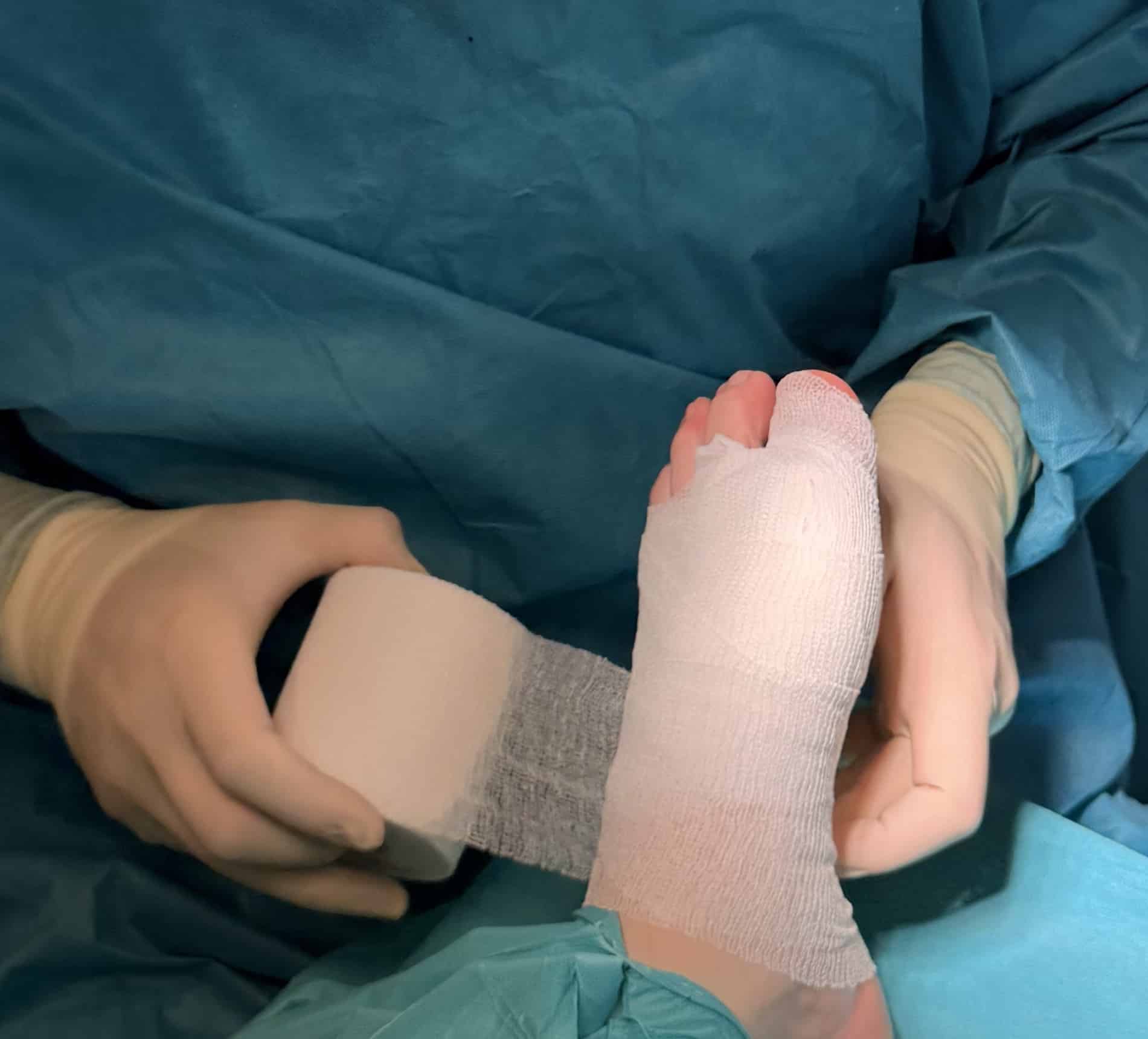 Die Fußoperation erfolgt unter Anästhesie und ist intraoperativ schmerzfrei. Postoperative Beschwerden lassen sich durch gezielte Schmerztherapie und angepasste Mobilisation in der Regel gut kontrollieren.